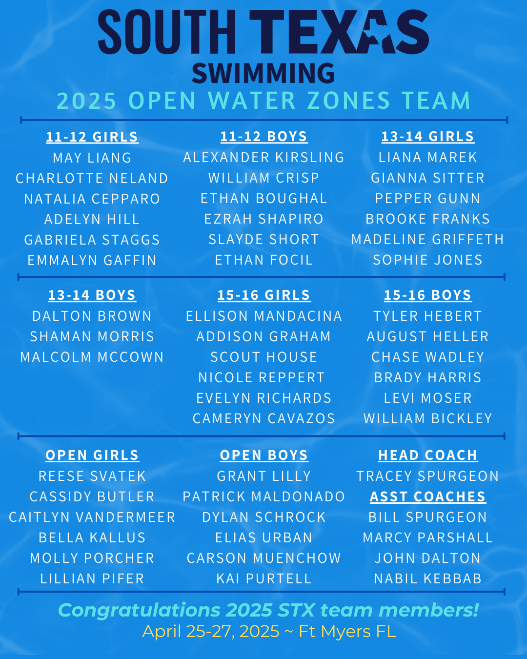 Congratulations to our 2025 South Texas Swimming Open Water Zones team!