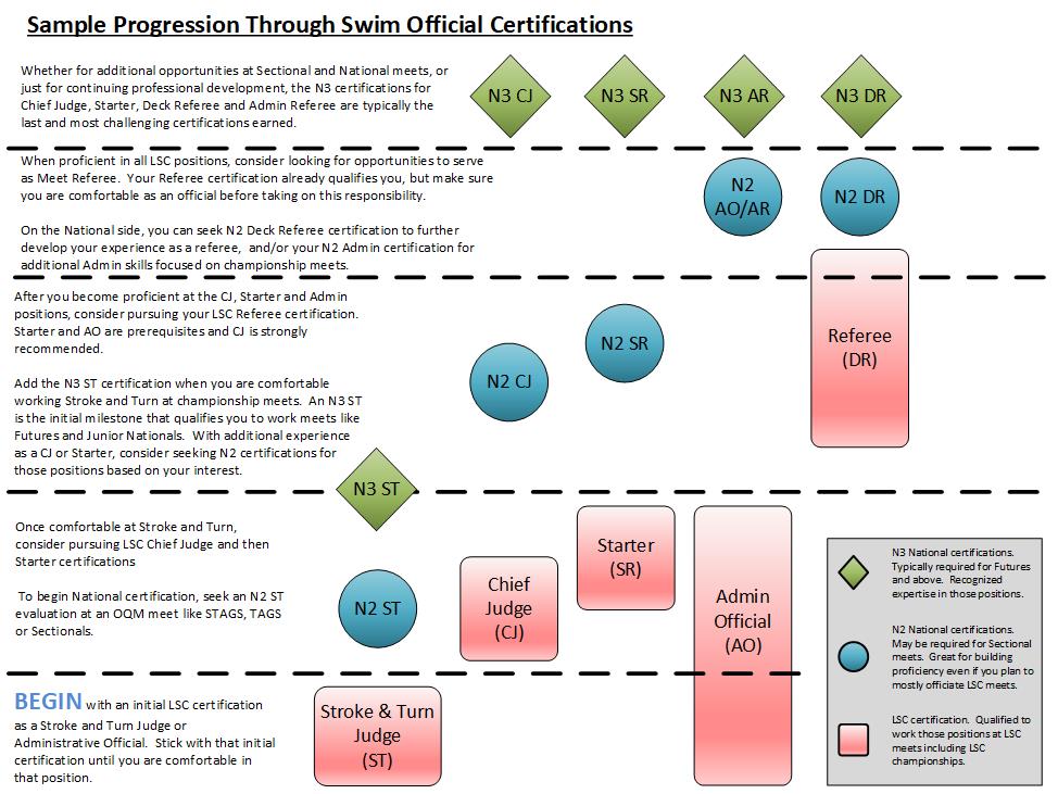 | REFEREE | Referee Certification Course | LINK | LINK | N2 or N3 DR -or- Experienced* LSC Referee -or- Officials Committee DR *An experienced Referee is one formerly held an MR certification or has been an LSC DR for at least 2 years and 24 sessions |